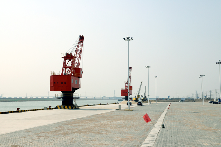 在五灌河碼頭現(xiàn)場,302米長的碼頭平臺上,2座20多米高的紅色座吊一字排開,在河水的映照下顯得格外“威武”。據(jù)碼頭工作人員介紹,這兩座吊機(jī)剛剛安裝并調(diào)試完畢,它們是五灌河碼頭運(yùn)營的最基本條件之一,一座25噸,另一座40噸,運(yùn)出貨物將通過這兩座吊機(jī)完成。